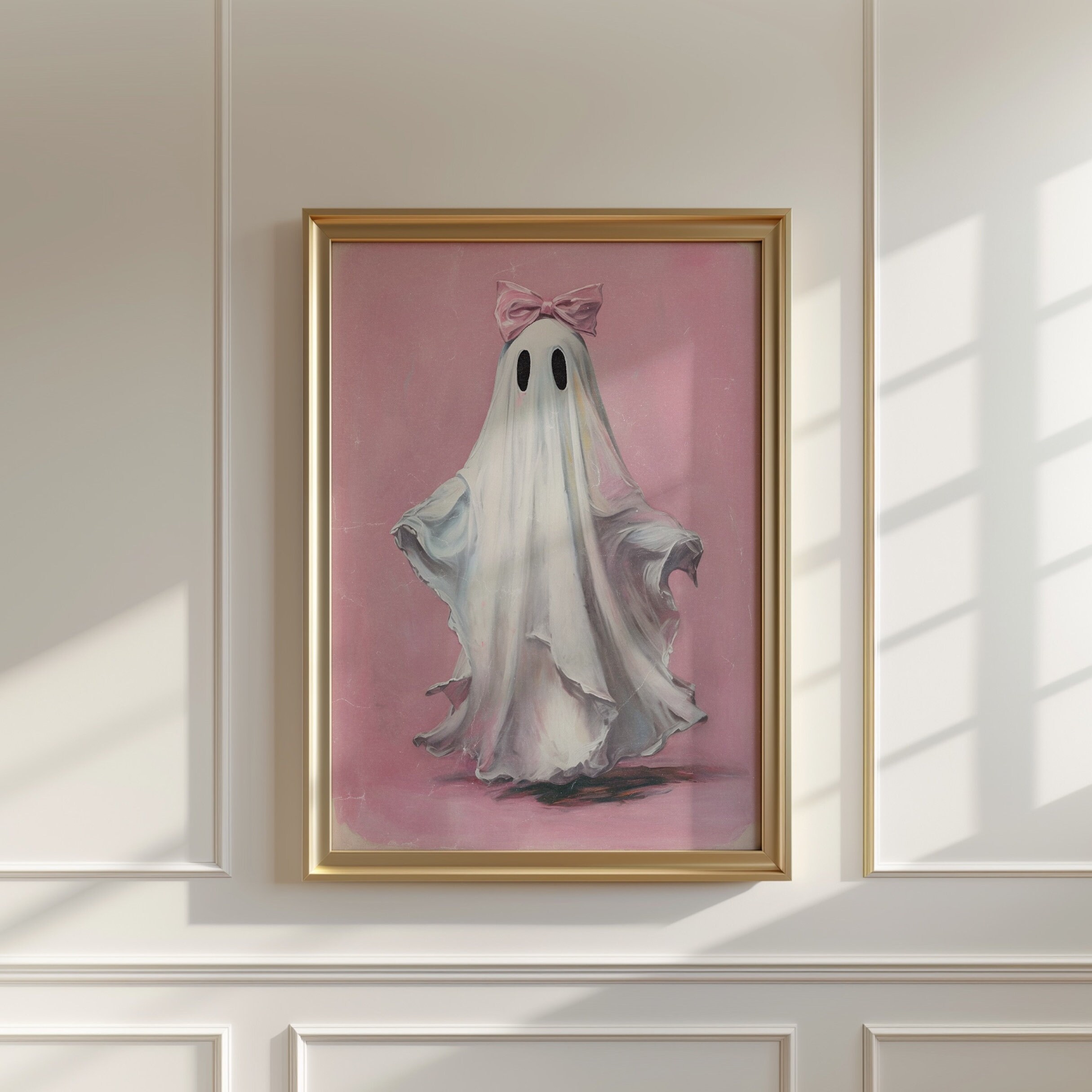• Order Pink Ghost Decor Supwhd Cute Halloween Ghosts Wall Art - 16x24 Inch Pink Bow Coquette Poster With Wooden Hanger Pink Bow Ghost Art