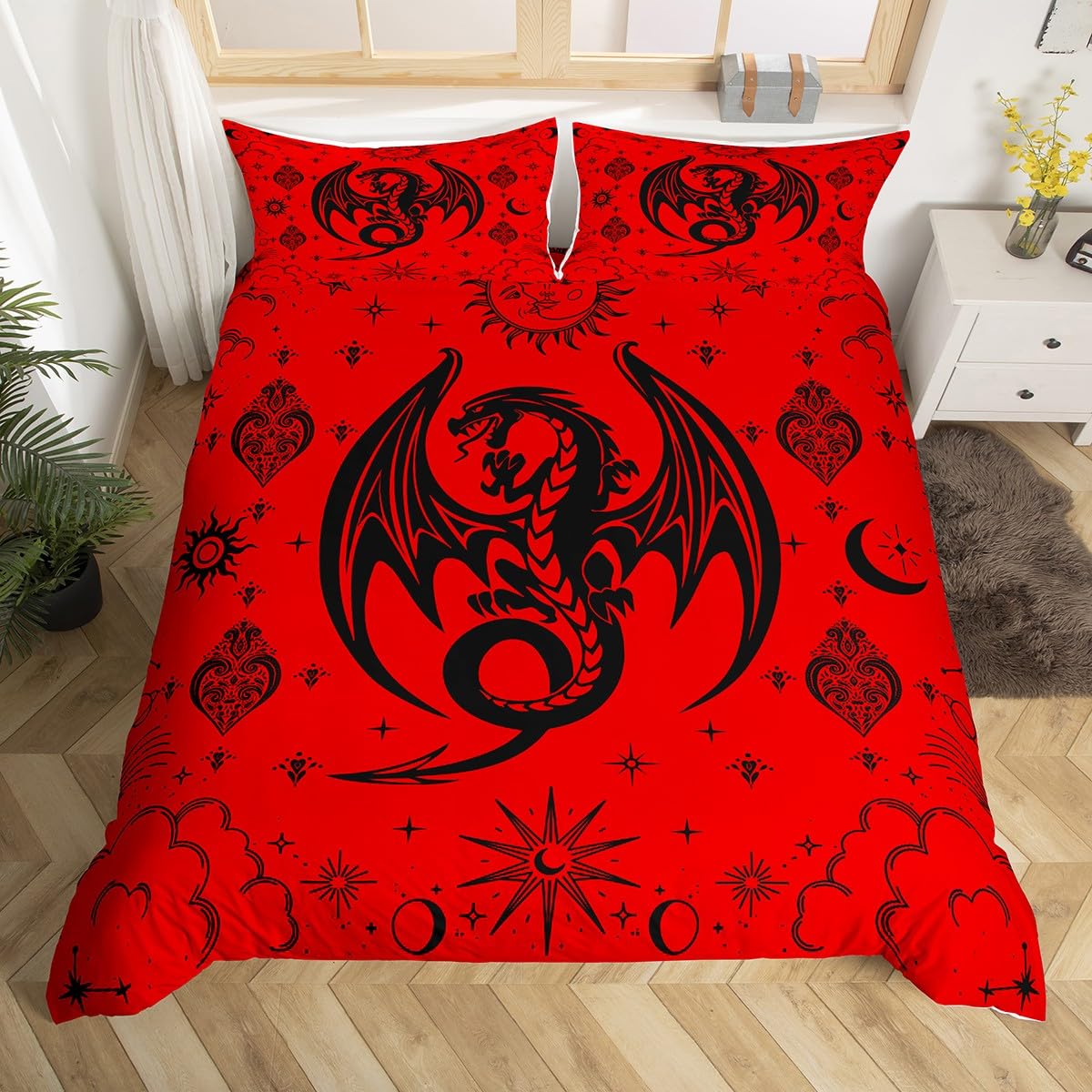 Western Magic Dragon Duvet Cover Set - Moon Star Boho Bedding With Gothic Dragon Design For Kids' Rooms